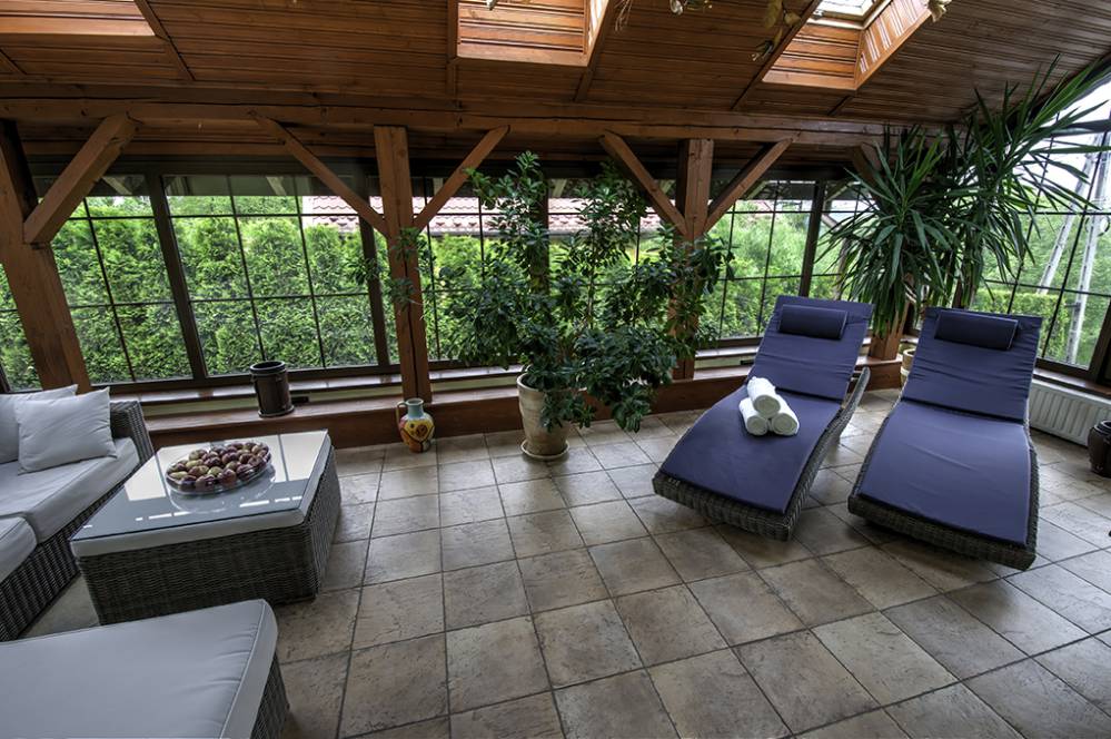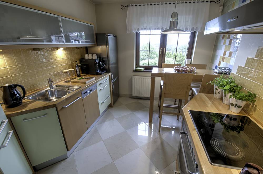 PARTER - 100m2 powierzchni, kuchnia z podstawowym wyposażenie ( lodówka, ceramiczna płyta kuchenna wraz z piekarnikiem, czajnik bezprzewodowy, naczynia kuchenne, zastawa stołowa, szkło, sztućce),salon kominkowy, część wypoczynkowa (skórzana sofa i 2 fotele), wyposażona w TV SAT, ogród zimowy z meblami ratanowymi, sypialnia – Classic Room Garden I, toaleta.