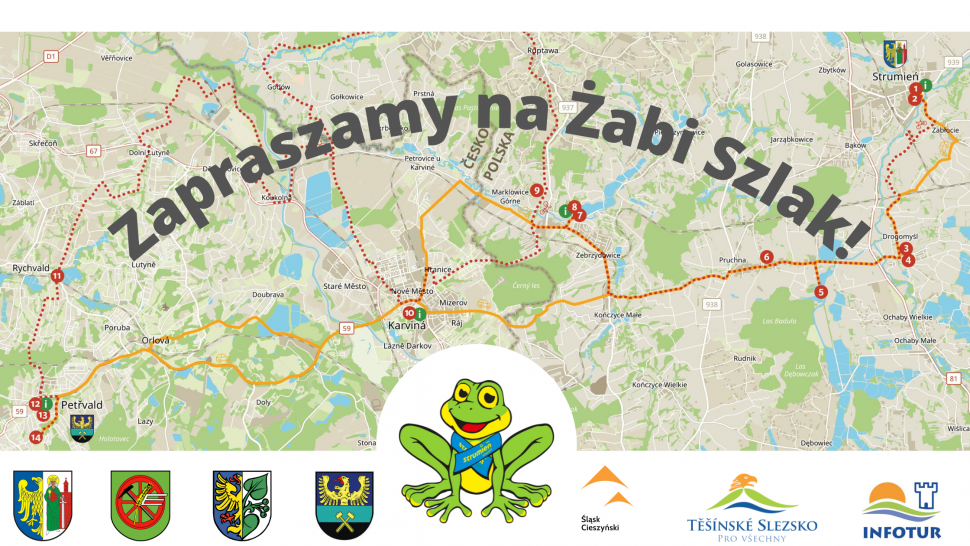 Drogi turysto, zapraszamy na nasze pogranicze! Odbierz w Punktach Informacji Turystycznej w Strumieniu, Zebrzydowicach i Karwinie oraz w Urzędzie Miejskim w Pietwałdzie mapę, stanowiącą równocześnie ulotkę do potwierdzania odwiedzenia atrakcji tych czterech, współtworzących ofertę gmin. Później udaj się do któregoś z tych Punktów, by udokumentować swój pobyt. Możesz wtedy liczyć na drobny upominek oraz odznakę „Żabiego Szlaku”.