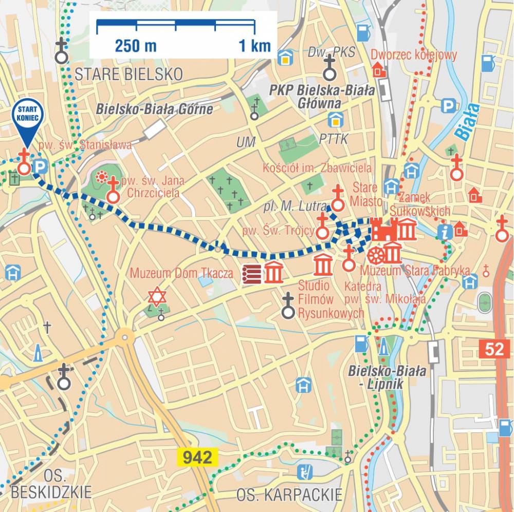 Wędrówkę rozpoczynamy od najstarszej budowli sakralnej w Bielsku-Bialej: kościoła pw. św. Stanisława. Parking dla SAM znajduje się w pobliżu, przy ul. św. Stanisława. BUS może tutaj wysadzić grupę i odjechać na parking na ul. Słowackiego, przy Bielskim Centrum Kultury. KOSCIÓŁ PW. ŚW. STANISŁAWA został zbudowany w stylu gotyckim ok. roku 1380 r. Najcenniejsze są w nim polichromie w prezbiterium i tryptyk ołtarzowy.