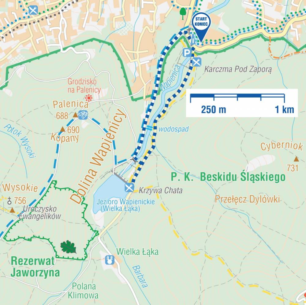 Obok chaty KORONA ZAPORY WODNEJ IM. PREZYDENTA IGNACEGO MOŚCICKIEGO. Została zbudowana w latach 1929–1932 na rzece Wapienica oraz potoku Barbara. Zbiornik powstały przez spiętrzenie wody to jezioro WIELKA ŁĄKA, zwane też Wapienickim. Kilka razy do roku odbywają się imprezy miejskie (np. Dzień Wody) lub spacery z przewodnikiem, podczas których korona zapory jest otwarta. Warto zatem śledzić informacje i aktualności z terenu Bielska-Białej. Z Krzywej Chaty wracamy żółtym szlakiem ok. 300 m, gdzie skręcamy w lewo w dróżkę bez znakowanych szlaków. Punktem orientacyjnym może być tablica informacyjna nr 4 „Ochrona pożytecznej fauny”, przy której skręcamy w lewo (na zachód). Nieoznakowaną (ale dobrze wydeptaną) ścieżką dochodzimy do kładki, którą przechodzimy na drugi brzeg potoku. Tu wchodzimy na niebieski szlak turystyczny. Skręcamy w prawo i za znakami niebieskiego szlaku dochodzimy do miejsca rozpoczęcia wędrówki. Łącznie 4 km.