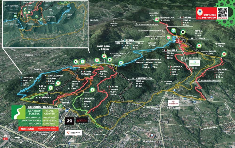 Enduro Trails w Bielsku-Białej to pierwszy i największy w Polsce ośrodek przeznaczony do uprawiania rowerowego enduro. Kompleks ten posiada obecnie ponad 40 kilometrów oznaczonych i stale utrzymywanych singletracków o różnej trudności: od tras zielonych przeznaczonych dla początkujących po czarne trasy dla ekspertów. Sieć tras w ośrodku Enduro Trails rozpościera się pomiędzy Szyndzielnią a Kozią Górą. Na Szyndzielnię wyjechać można koleją gondolową, a stamtąd zjechać na Kozią Górę i dalej, aż do samego centrum ścieżek na bielskich Błoniach. Zjazd niebieskimi trasami typu flow z Szyndzielni na Błonia ma ponad 11 kilometrów i należy do najdłuższych w Europie. Na terenie ośrodka znajdują się: wypożyczalnia rowerów, liczne punkty gastronomiczne, pumptrack, bezpłatne parkingi i inne udogodnienia, jak np. place zabaw dla dzieci czy ścieżki spacerowe.