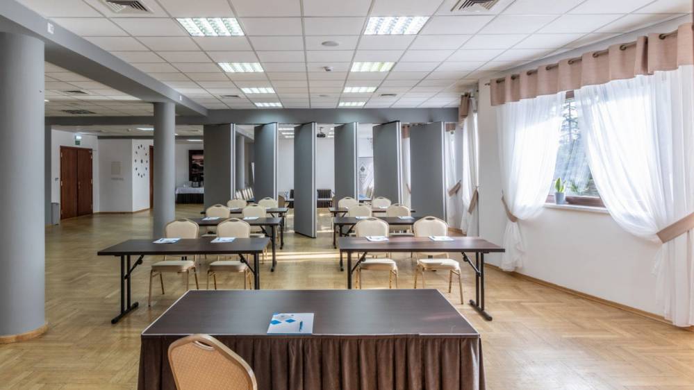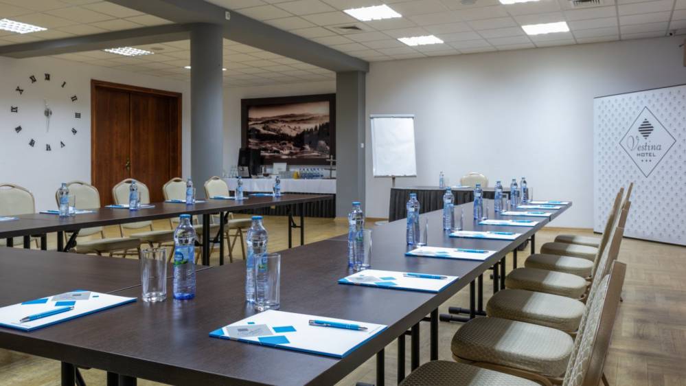 Hotel Vestina położony w Wiśle-Malince oddaje do dyspozycji dużą 200-metrową salę. Sala posiada przesuwne ściany mobilne, w razie konieczności można ją wydzielić na dwie mniejsze przestrzenie pod szkolenia. Sala znajduje się tuż obok restauracji, w której serwujemy słodką przerwę kawową. Posiadamy profesjonalne nagłośnienie, ekran pod rzutnik oraz flipchart – wszystkie niezbędne rzeczy potrzebne do organizacji szkolenia. Salę możemy przygotować wedle wytycznych: w układzie teatralnym, szkolnym, kameralnym lub w kształcie litery U.