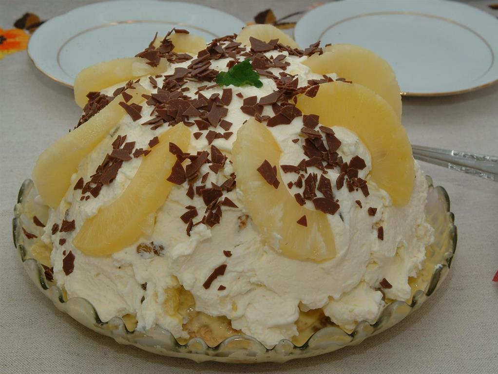 4 jajka ubijamy z 8 łyżkami cukru i cukrem waniliowym, a następnie ucieramy z 2 kostkami masła. Łączymy krem masłowy z pokruszonym biszkoptem i uprzednio namoczonymi w spirytusie bakaliami. Formujemy kopę, którą dekorujemy ubitą śmietaną i owocami. Podajemy z małą kawą.