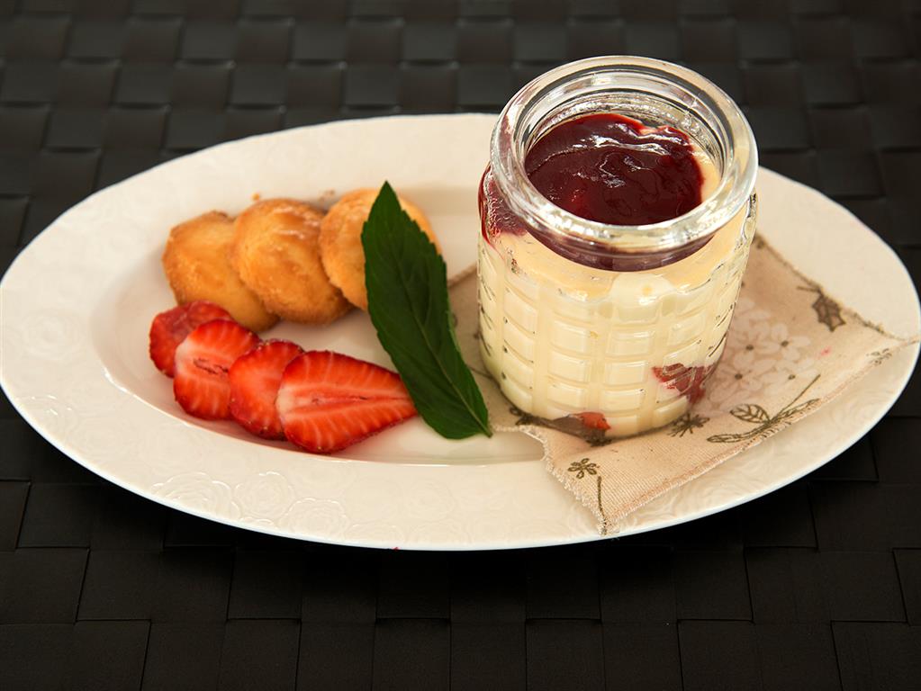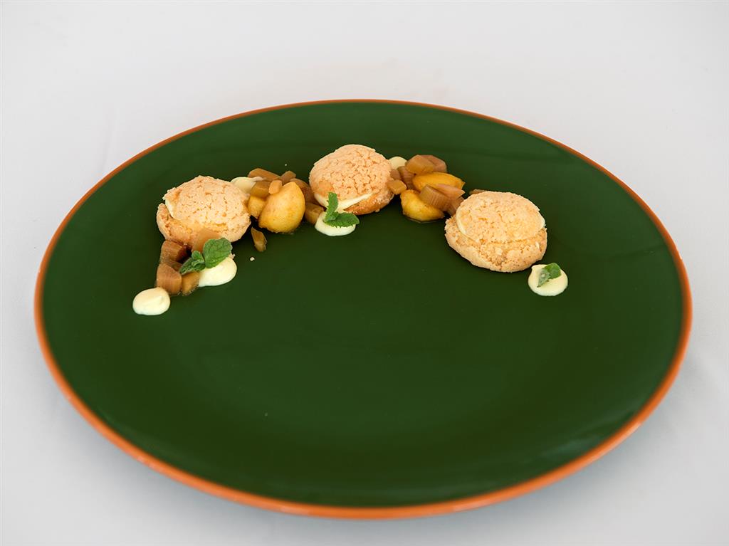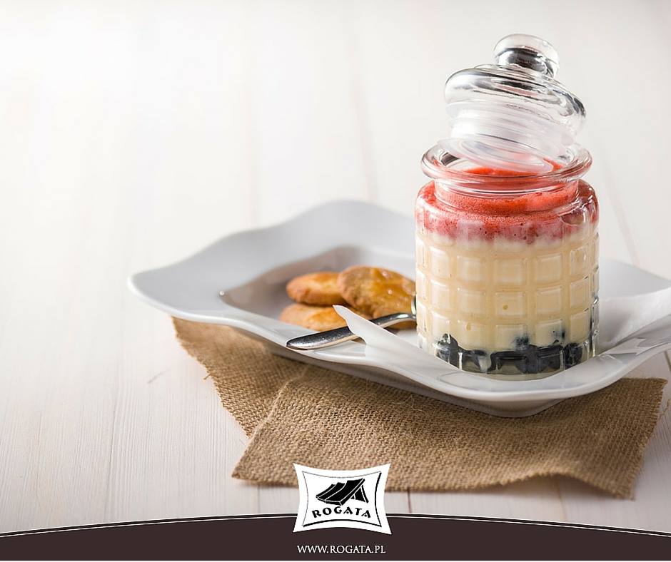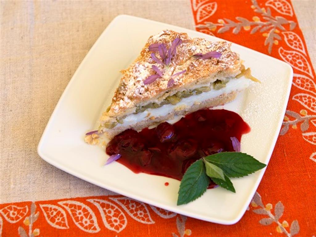 Rabarbar pokroić, zasypać cukrem i odstawić. Z przygotowanych składników wyrobić ciasto. Na samym końcu dodać śmietanę i żółtka, zagnieść i schłodzić w lodówce. Formę wyłożyć połową porcji ciasta wyjętego z lodówki, nakłuć widelcem i piec w 150˚C przez około 15 minut. Z mleka, budyniu i cukru przygotować masę budyniową i rozsmarować ją na podpieczonym spodzie ciasta, następie ułożyć rabarbar. Resztę kruchego ciasta pokruszyć na wierzch. Piec około 40 minut w temperaturze 180˚C.
