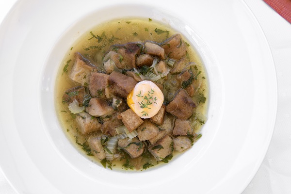 Gotować domową kurę z warzywami około 2 godzin. Następnie pokroić chleb w kostkę i przesmażyć na maśle. Osobno przesmażyć również seler i cebulę. Połączyć składniki z bulionem i dodać siekany lubczyk. Doprawić pieprzem i solą. Dusić około 10 minut. Żółtko oddzielone od białka ugotować w osolonej wodzie. Serwować w głębokim talerzu.