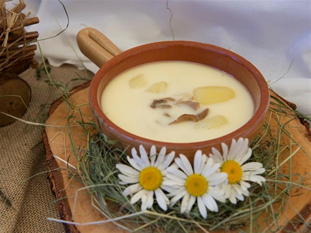 100 g borowika suszonego namoczyć w zimnej wodzie na około 20 minut. Do garnka wlać 600 ml soku z kiszonej kapusty, zagotować. Dodać śmietanę i zahartować. Całość zagotować. Zdjąć z palnika i dodać 20 g masła. Suszone borowiki gotować do miękkości w tej samej wodzie co się moczyły. Osobno gotować, do miękkości, w osolonej wodzie 4 średnie obrane ze skórki ziemniaki.