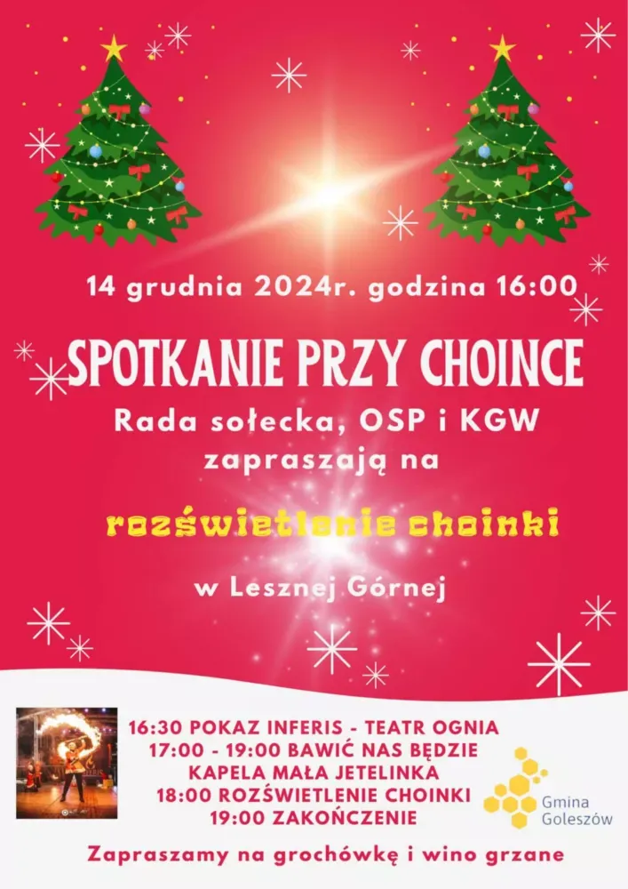 Rada sołecka Lesznej Górnej wspólnie z miejscową jednostką Ochotniczej Straży Pożarnej oraz Kołem Gospodyń Wiejskich zaprasza na spotkanie przy choince. W programie m.in. pokaz teatru ognia, występ kapeli Mała Jetelinka oraz rozświetlenie choinki. Impreza odbędzie się w sobotę, 14 grudnia przy Transgranicznym Centrum Szkolenia Strażaków. Początek imprezy o godzinie 16.00.