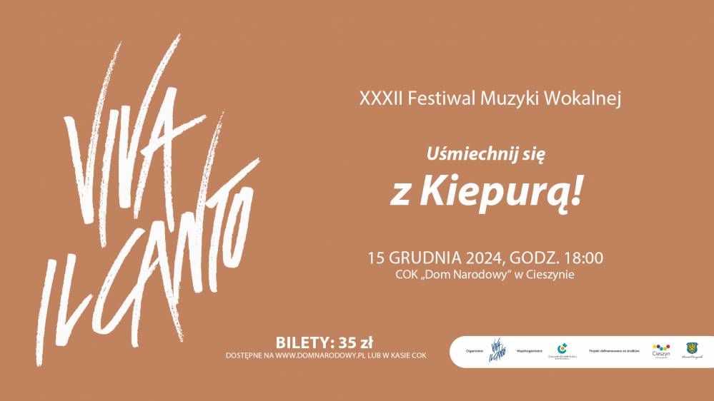 Cieszyński Ośrodek Kultury "Dom Narodowy" serdecznie zaprasza na koncert w ramach XXXII Festiwalu Muzyki Wokalnej organizawnym przez Viva Il Canto na koncert "Uśmiechnij się z Kiepurą", który odbędzie się 15 grudnia 2024 na Sali widowiskowej Domu Narodowego