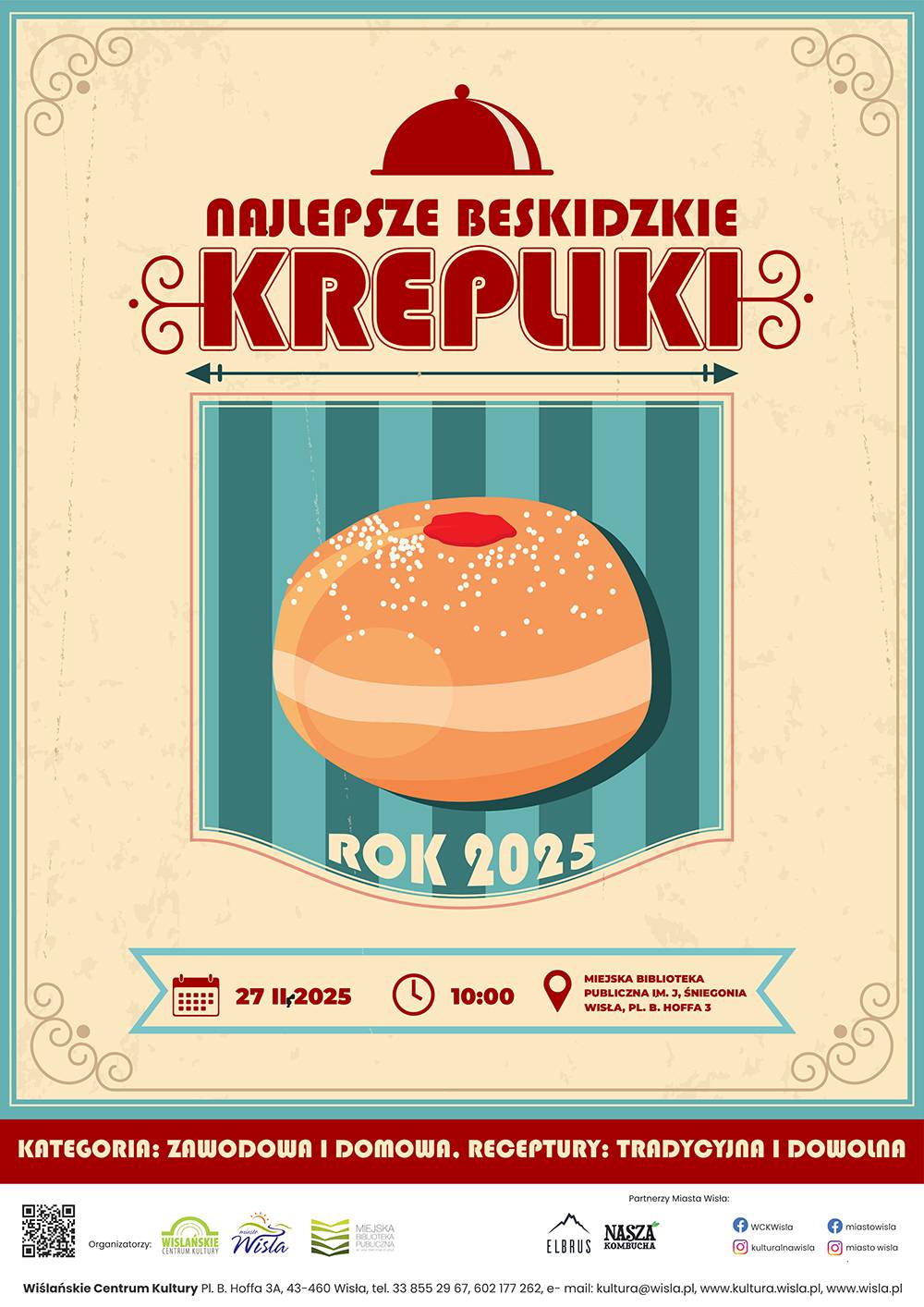 Jak co roku zapraszamy Państwa do udziału w fantastycznym tłustoczwartkowym Konkursie na Najlepsze Beskidzkie Krepliki. W tym roku konkurs odbędzie się 27 lutego o godzinie 10.00 w holu Miejskiej Biblioteki Publicznej im. Jana Śniegonia w Wiśle. Konkurs skierowany jest do mieszkańców powiatu cieszyńskiego.