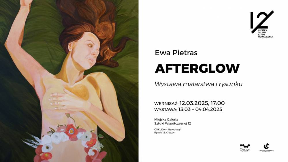 Zapraszamy na wystawę malarstwa i rysunku Ewy Pietras pt. "AFTERGLOW". Otwarcie wystawy odbędzie się w środę, 12 marca 2025 o godzinie 17:00 w Miejskiej Galerii Sztuki Współczesnej 12, na parterze Domu Narodowego w Cieszynie. Wystawę będzie można odwiedzać do 4 kwietnia 2025r