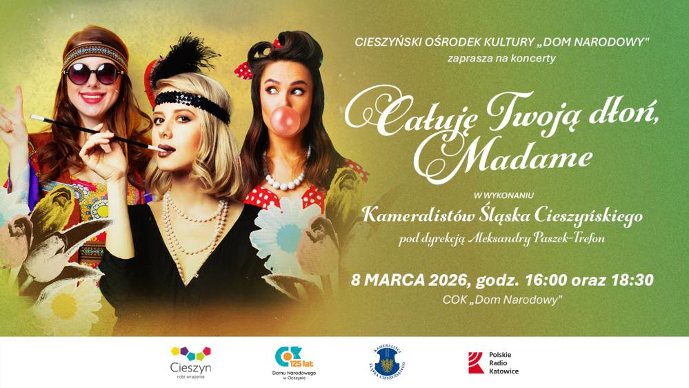 Wyjątkowy sposób na spędzenie Dnia Kobiet? Cieszyński Ośrodek Kultury „Dom Narodowy” zaprasza na niezwykły koncert Kameralistów Śląska Cieszyńskiego pt. „Całuję Twoją dłoń, Madame”. Ten kameralny wieczór muzyczny to podróż przez czas i style - od barokowych salonów po paryskie impresjonistyczne wnętrza, od operetkowego blasku po retro klimaty lat 20. W repertuarze znajdą się pieśni i utwory instrumentalne, które łączą różne epoki, style i kultury, tworząc spójną opowieść o miłości, tęsknocie i pięknie gestu.