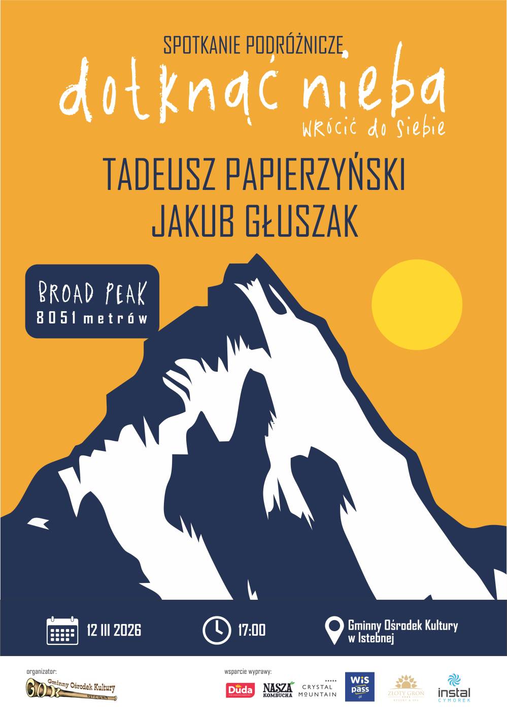 Gminny Ośrodek Kultury w Istebnej serdecznie zaprasza na spotkanie podróżnicze z Tadeuszem Papierzyńskim oraz Jakubem Głuszakiem - Dotknąć Nieba wrócić do siebie, które odbędzie się w czwartek 12 marca w siedzibie Gminnego Ośrodka Kultury w Istebnej. Motywem przewodnim spotkania będzie wyprawa na Broad Peak. Ośmiotysięcznik zlokalizowany na granicy Chin i Pakistanu.