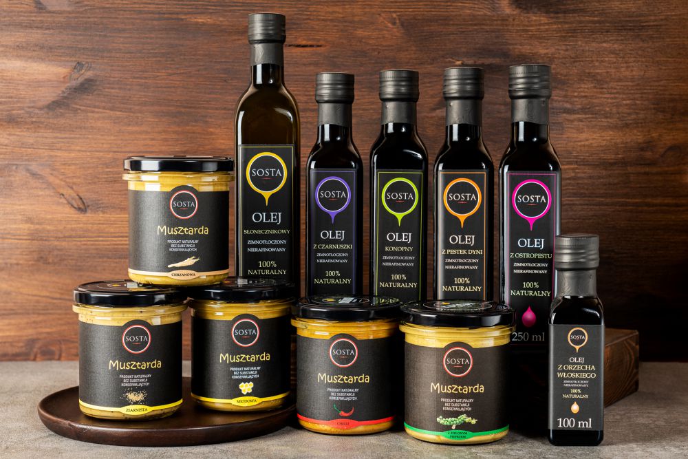 Proste receptury i doskonała jakość składników to wyróżniki produktów firmy SOSTA. Tłoczone na zimno oleje: lniany, rzepakowy, z pestek dyni, z wiesiołka, z orzecha włoskiego czy ogórecznika, charakteryzuje głęboki aromat i niepowtarzalny smak. Gorczyca, ocet jabłkowy i prawdziwy miód to prosta baza musztard, gwarantująca ich szlachetny smak. Tym co nadaje charakter są przyprawy – chilli, pieprz, kolendra i chrzan. Część produktów posiada certyfikat BIO.