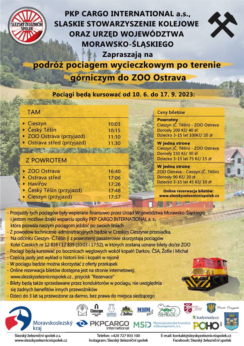 Wyjeżdżamy w każdą sobotę i niedzielę od 10 czerwca do 17 września z Cieszyna (10:03), zatrzymujemy się na przystanku w Czeskim Cieszynie (10:15), a następnie wyruszamy wzdłuż niepublicznych bocznic węglowych do nowo wybudowanego przystanku Josefova jáma-Ostrava Zoo, skąd to tylko krótki spacer do bramy Zoo w Ostrawie.