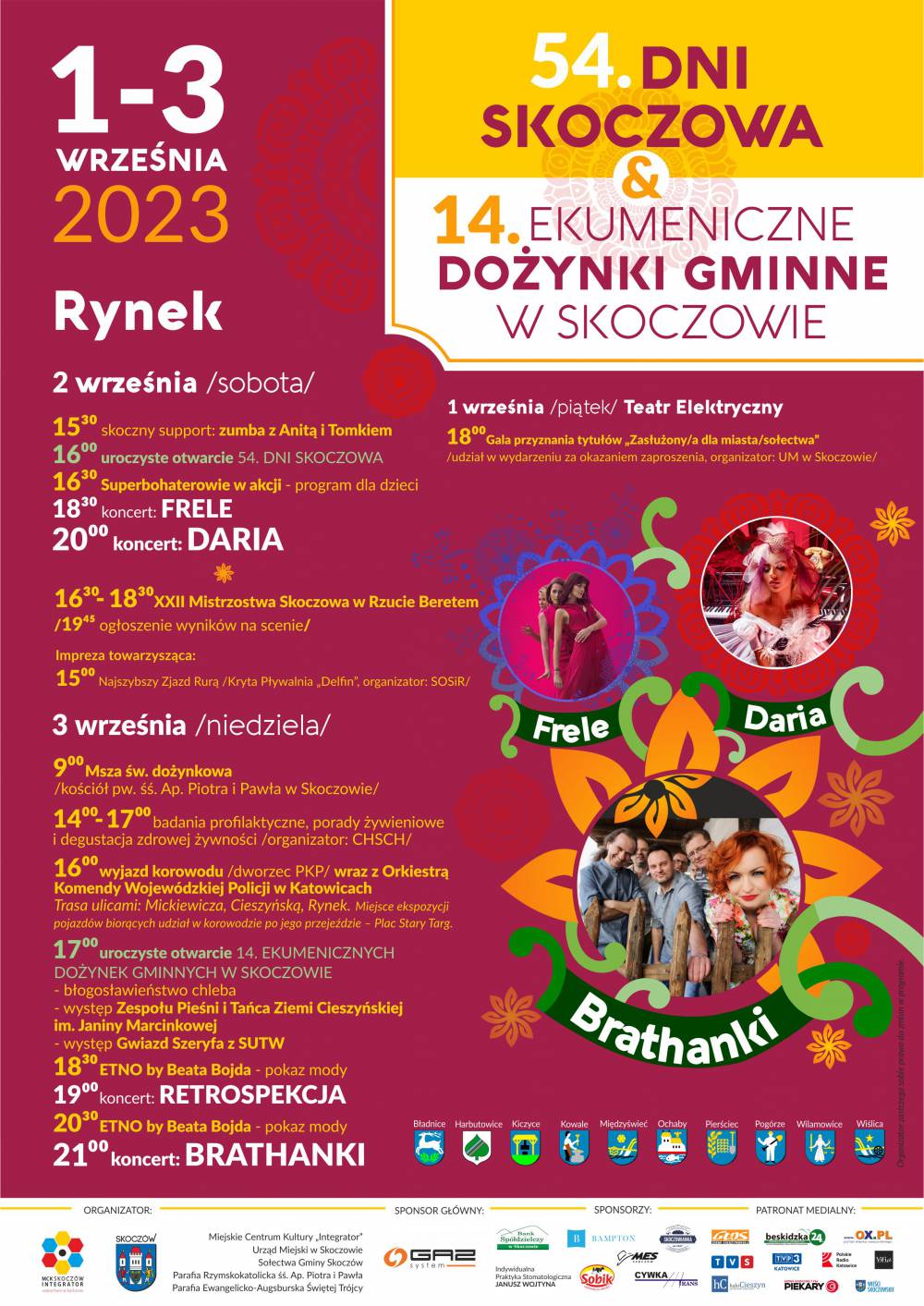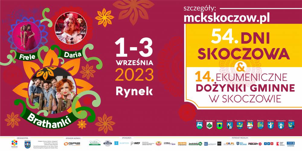 Pełne emocji, przebojów, kwiatów, ale i sentymentów oraz pozytywnej energii zapowiadają się tegoroczne Dni Skoczowa, połączone z dożynkami. W pierwszy weekend września, w centrum miasta, będzie bardzo głośno i żywiołowo za sprawą występów scenicznych – wśród gwiazd 54. Dni Skoczowa & Ekumenicznych Dożynek Gminnych w Skoczowie pojawią się: BRATHANKI, DARIA, FRELE! Ponadto utwory Anny Jantar przypomni zespół Retrospekcja, a w nasz rodzimy folklor zanurzy publiczność Zespół Pieśni i Tańca Ziemi Cieszyńskiej im. Janiny Marcinkowej. Szykuje się też przepiękne, kobiece, pełne kwiatów widowisko – pokaz mody ETNO by Beata Bojda. Nie zabraknie tradycyjnego dożynkowego korowodu oraz Mistrzostw Skoczowa w Rzucie Beretem, którego już chyba nikomu nie trzeba reklamować (berety poszybują nad miastem już po raz 22.!)
