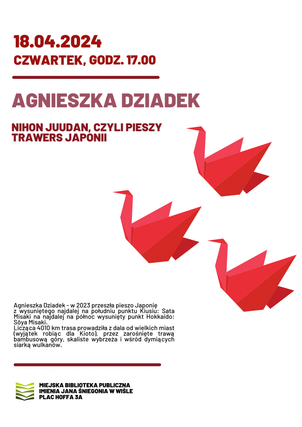 Najprawdopodobniej jako pierwsza na świecie kobieta i pierwsza osoba, która nie szła tylko drogami, ale jak najwięcej górami, Agnieszka Dziadek w 2023 przeszła pieszo Japonię z wysuniętego najdalej na południu punktu Kiusiu: Sata Misaki na najdalej na północ wysunięty punkt Hokkaido: Sōya Misaki. Licząca 4010 km trasa została przez Agnieszkę samodzielnie zaplanowana. Prowadziła z dala od wielkich miast (wyjątek robiąc dla Kioto), przez zarośnięte trawą bambusową góry, skaliste wybrzeża i wśród dymiących siarką wulkanów. Nie znając miejscowego języka ani pisma podróżniczka lądowała w gęstych zaroślach, ostojach pijawek drzewnych czy w środku osuwisk, ale niezwykle życzliwi mieszkańcy kraju wschodzącego słońca zawsze przychodzili jej z pomocą, dzieląc się zieloną herbatą i dobrym słowem, a nawet udzielając wschodnich błogosławieństw. Wyprawa trwała 137 dni i zawierała też przerywnik w postaci podróży dookoła Tajwanu wymuszonej przez już nie tak życzliwy urząd imigracyjny.