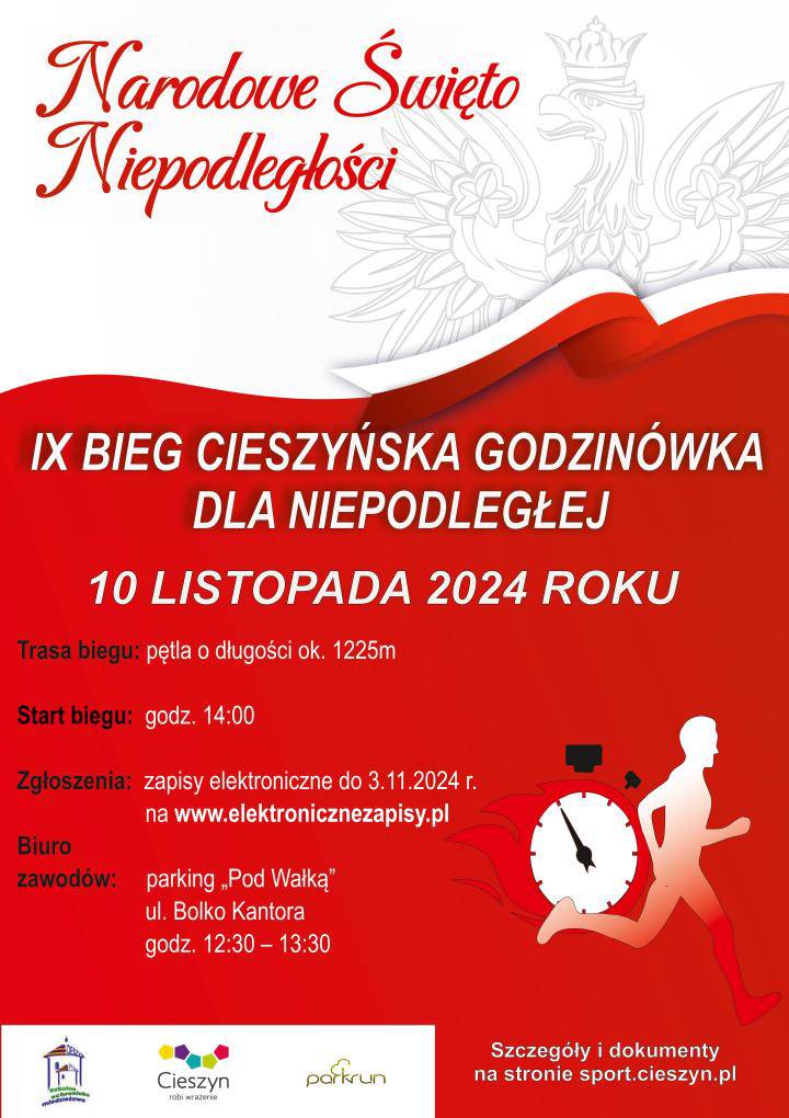 Wydział Sportu Urzędu Miejskiego w Cieszynie, Szkolne Schronisko Młodzieżowe w Cieszynie zapraszają do wzięcia udziału w IX Biegu Cieszyńska Godzinówka dla Niepodległej, który odbędzie się 10 listopada 2024 roku w Cieszynie!