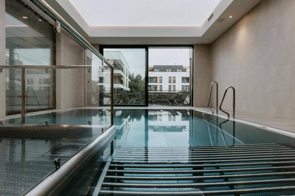 Zaplecze odnowy biologicznej obiektu VISLOW Resort obejmuje kryty basen, saunę i wannę spa.