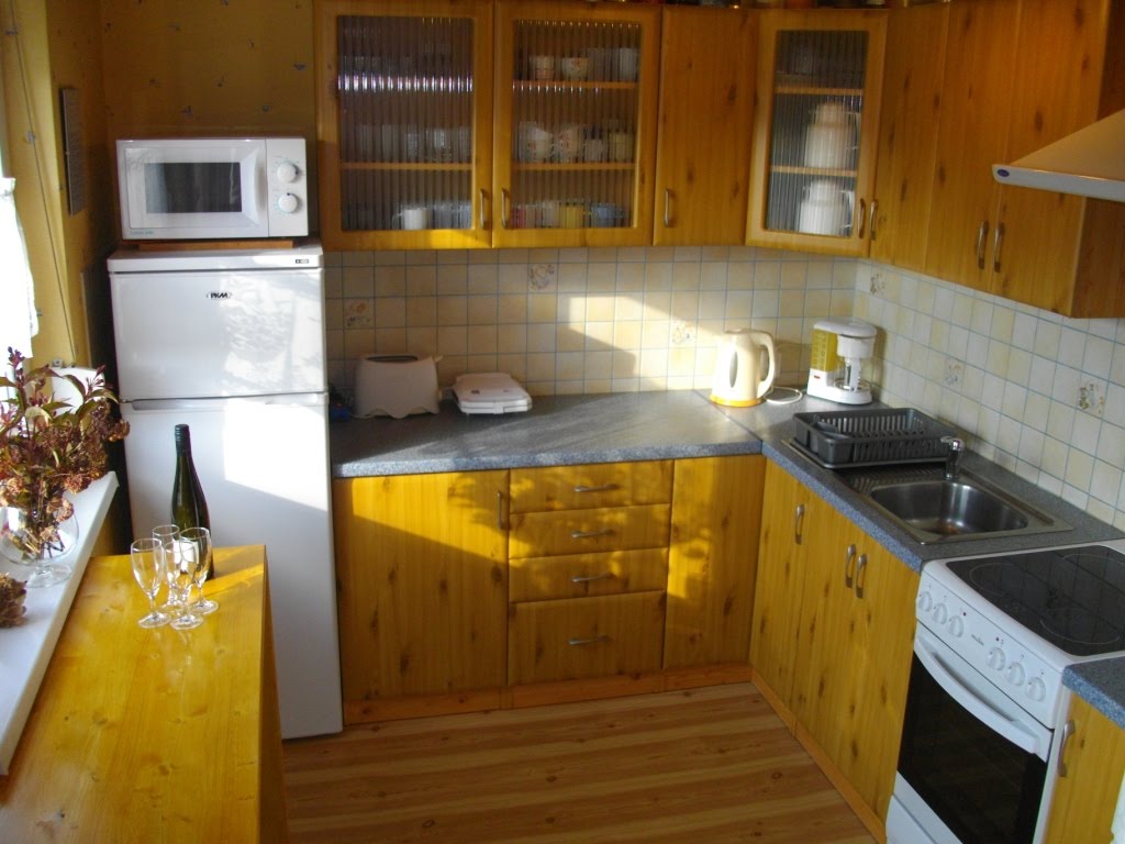 Na parterze jest pokój dwuosobowy, wyposażona kuchnia, gdzie można sobie przygotować posiłki, przestronny salon z kominkiem z TV, łazienka z prysznicem i taras widokowy.