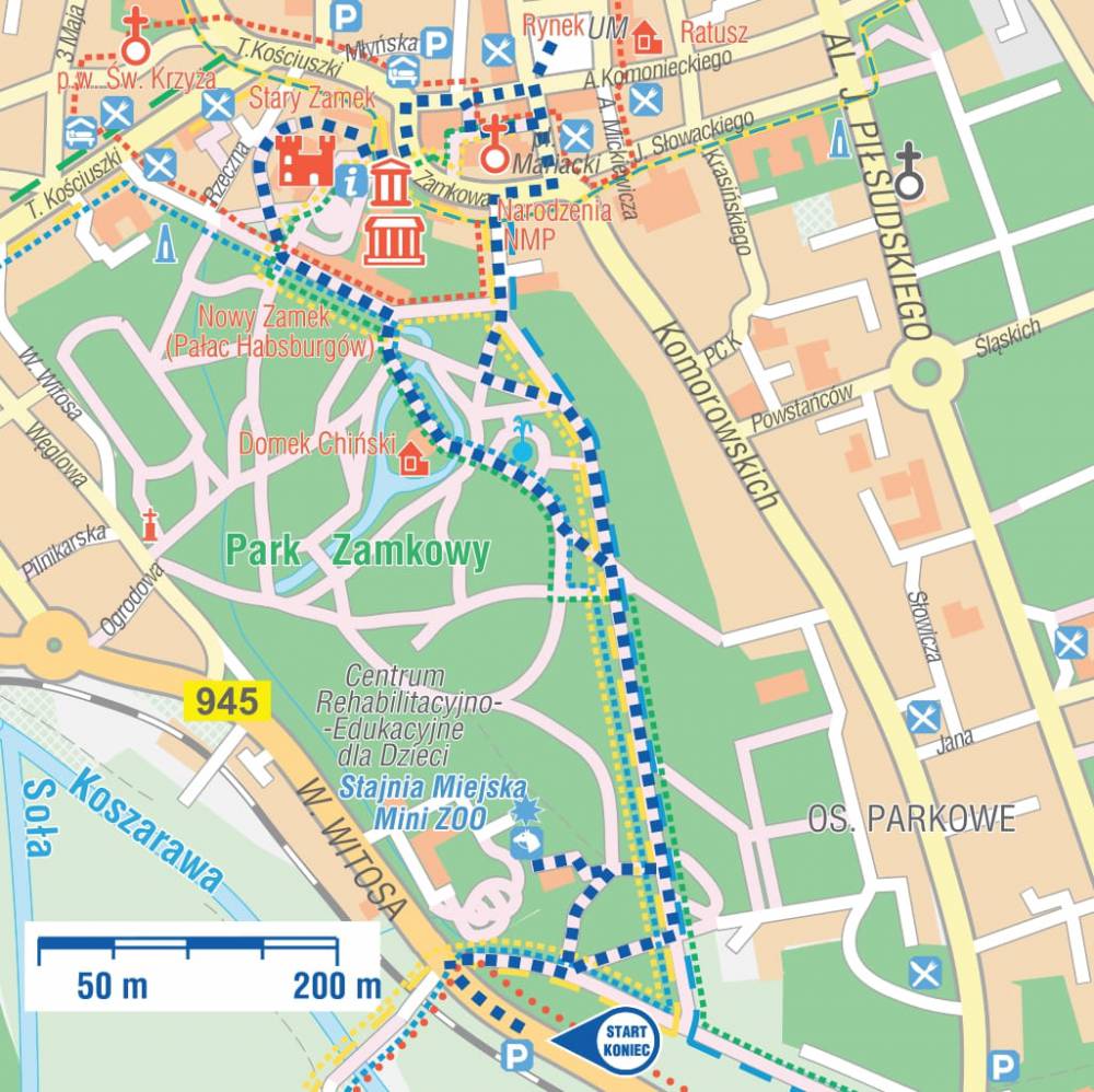 My jednak skręcamy w lewo i idziemy wzdłuż pałacu, a za nim skręcamy w prawo i wchodzimy na dziedziniec Starego Zamku. W zamku mieści się MUZEUM MIEJSKIE, jest winda. W oficynach dla wózkowiczów dostępne są tylko ekspozycje na parterze. Przez oficynę wychodzimy na ul. Zamkową. Skręcamy w lewo. Ostatni budynek po prawej to SIEJBA – najstarsza żywiecka kamienica z końca XVIII w. Za Siejbą skręcamy w prawo w ul. Kościuszki i wchodzimy w wąską uliczkę miedzy kamienicami. Jesteśmy przed KONKATEDRĄ NARODZENIA NMP. Na wejściu jeden sto pień do pokonania. Wracamy na ul. Kościuszki i skręcamy w prawo. Dochodzimy do rynku. W narożniku kamienna dzwonnica z XVIII w. Z rynku wychodzimy do ul. Komorowskich. Przed dzwonnicą pomnik Jana Pawła II, a na ścianie dzwonnicy tablica upamiętniająca pobyt papie ża Jana Pawła II, w Żywcu w dniu 22 maja 1995 r. Skręcamy w prawo w ul. Zamkową i przez bramę Domu Katolickiego przechodzimy do Parku Zamkowego. Idąc prosto ścieżką parkową wcho dzimy na żółty szlak, którym wędrujemy do parkingu. Łącznie 2,6 km.