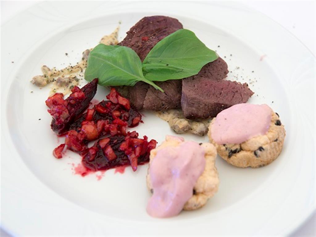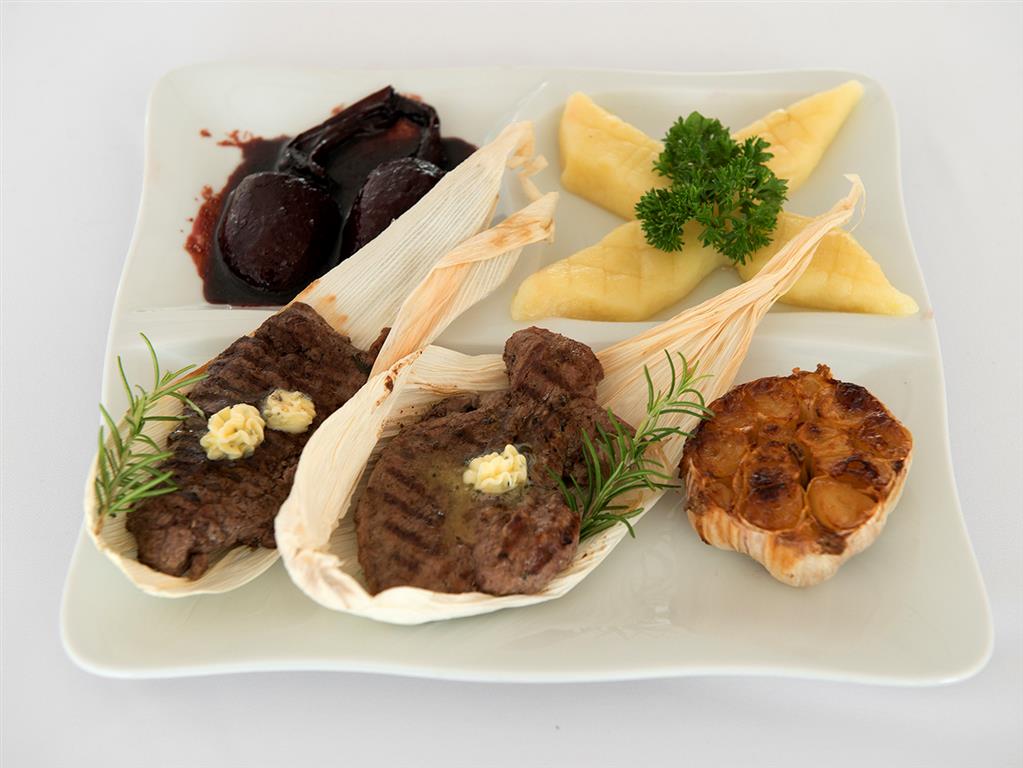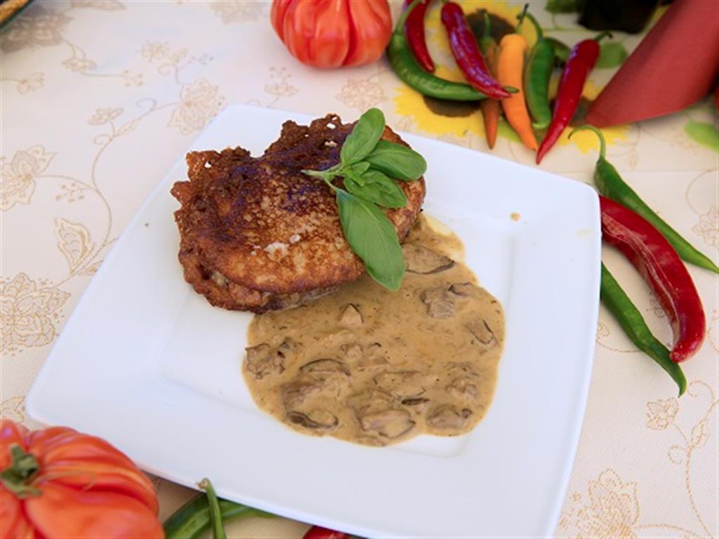 Grzyby usmażyć na niewielkiej ilości oleju z dodatkiem cebuli. Ziemniaki, cebulę obrać, zetrzeć na tarce, przyprawić solą, pieprzem, maggi, dodać jaja, mąkę, śmietanę kremową. Wszystko dobrze wymieszać i porcjować na patelni smażąc na oleju. Steki rozbić młotkiem do mięsa, przyprawić pieprzem, solą, maggi, curry, czosnkiem. Smażyć na oleju do uzyskania odpowiedniej kruchości. Podawać na talerzu placek-stek-placek z dodatkiem smażonych grzybów leśnych.