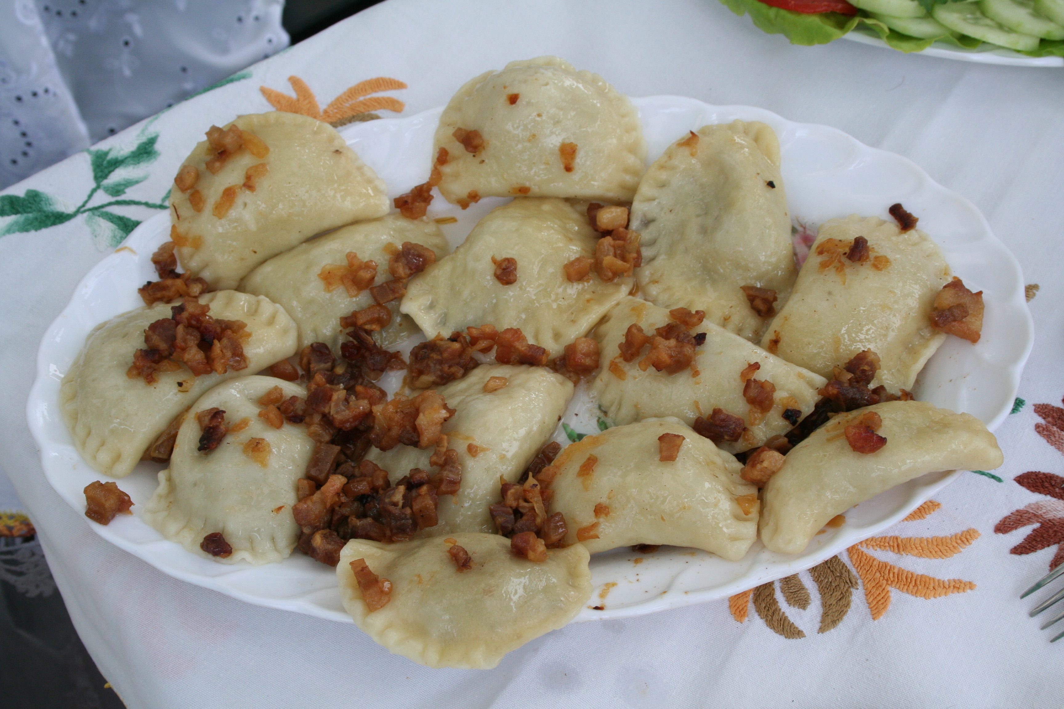 Zagniatamy ciasto ze składników, cienko rozwałkowujemy, nadziewamy farszem i wykrawamy pierożki foremką. Gotujemy w osolonej wodzie. Wysmażamy boczek z cebulką i polewamy ułożone na półmisku pierożki.
