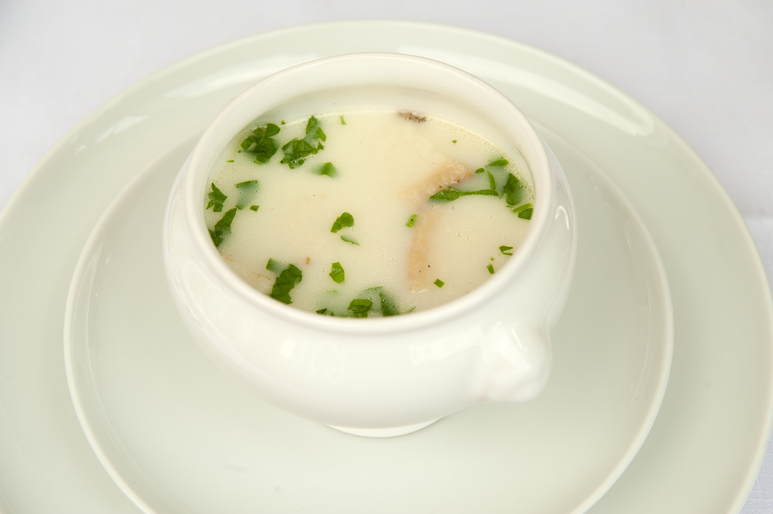 Wywar zagotować. Na drobnej tarce zetrzeć czosnek i zeszklić go na oliwie. Do rondla wlać szklankę wywaru i zmiksować z nim serki topione. Połączyć wszystko i zagotować. Na rozgrzaną patelnię dać trochę masła i startego czosnku i pokrojoną w drobną kostkę bułkę kanapkową. Piec 3-5 min, tak by powstały chrupiące grzanki. Zupę podawać w głębokich talerzach lub miseczkach z grzankami i odrobiną zielonej pietruszki.