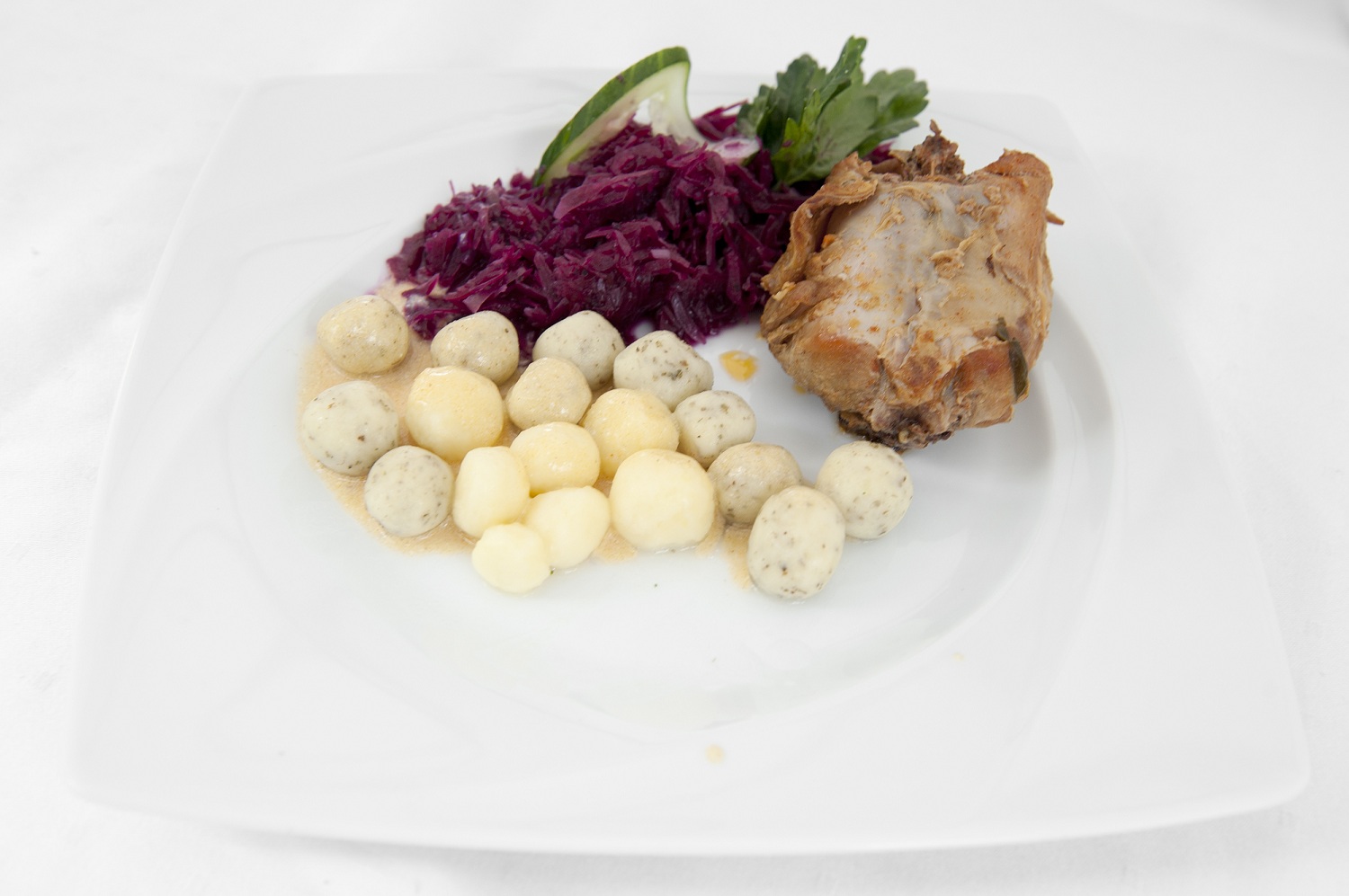 oczyszczonego królika wysmarować solą i czosnkiem, odstawić na 3 godziny. W dużej brytwance roztopić trochę masła, wyłożyć całą tuszą królika i obłożyć boczkiem z warzywami (marchew i lubczyk). Królika pieczemy w piekarniku podlewając rosołem, gdy będzie miękki podlewamy śmietaną i lekko gotujemy. Gotowanego wykładamy na paterę, a sos wlewamy do sosjerki. Podajemy z kluskami "małymi" i modrą kapustą.