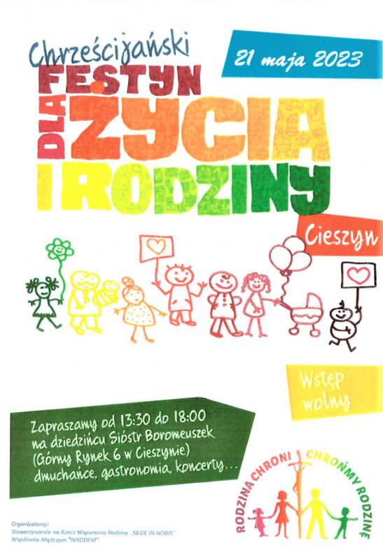 Stowarzyszenie na Rzecz Wspierania Rodziny "Siloe in Nobis" i Wspólnota Mężczyzn "NIKODEM" zapraszają na festyn, który odbędzie się 21 maja w godzinach 13:30 - 18:00, na dziedzińcu Zakładu Opiekuńczo-Leczniczego Sióstr Boromeuszek w Cieszynie przy ul. Górny Rynek 6.