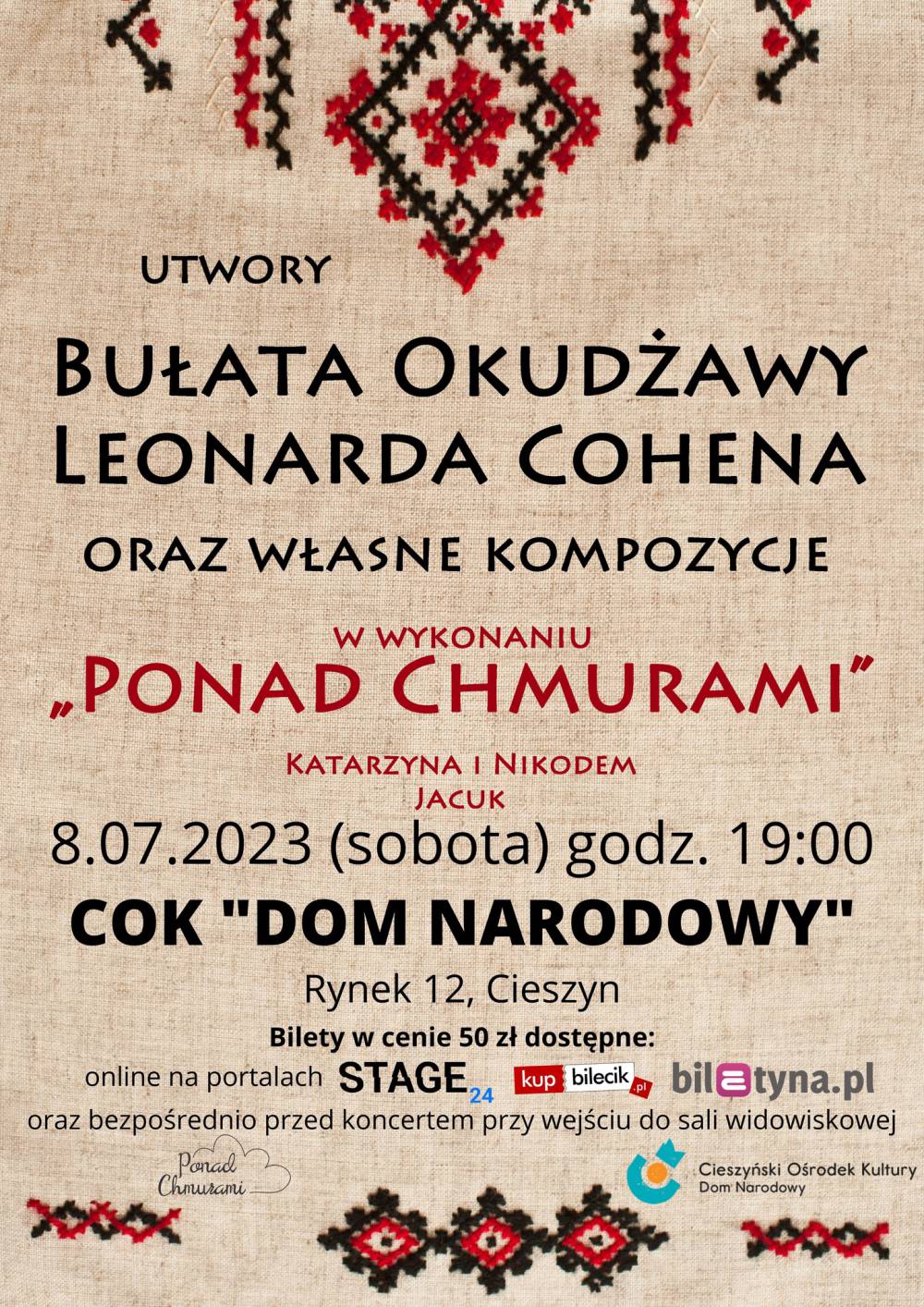Zespół wykona także utwory Bułata Okudżawy oraz Leonarda Cohena w polskich tłumaczeniach. "Ponad Chmurami" wciąż przemierza koncertowe szlaki, spotykając się z szerokim gronem słuchaczy na terenie całego kraju. W zgromadzonej publiczności wyzwalają naturalne emocje, prowadząc przez repertuar tak, aby poruszyć, wzbudzić nostalgię, by ostatecznie pozostawić słuchacza z radością i wesoło brzmiącym refrenem na ustach. Historia zespołu sięga dziesięciu lat. Ponad Chmurami wystąpił jako gość specjalny na Międzynarodowym Festiwalu im. Bułata Okudżawy, gdzie ich występ zachwycił m.in. żonę Bułata Okudżawy. Są także laureatami wielu konkursów z nurtu piosenki poetyckiej, m.in. 1 miejsca i nagrody publiczności na Festiwalu Danielka 2022. Poza występami na terenie całej Polski mają na swoim koncie wydanych kilka płyt CD, w tym najnowszą „Czas nic nie zmienił” wydaną w łódzkim wydawnictwie Dalmafon.