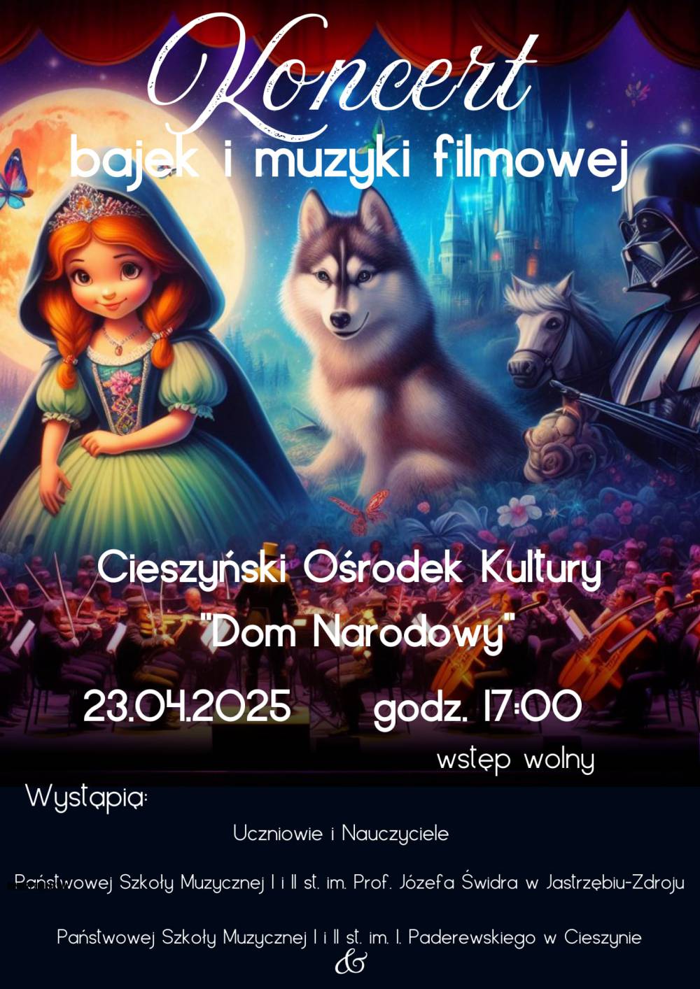 Wszystkie dzieci młodsze i starsze zapraszamy na niezwykły Koncert Bajek i Muzyki Filmowej, który odbędzie się w środę 23 kwietnia 2025 o godzinie 17:00 w Domu Narodowym w Cieszynie! Wystąpi Orkiestra Państwowej Szkoły Muzycznej I i II st. w Jastrzębiu-Zdroju oraz Uczniowie Państwowej Szkoły Muzycznej I i II st. w Cieszynie.