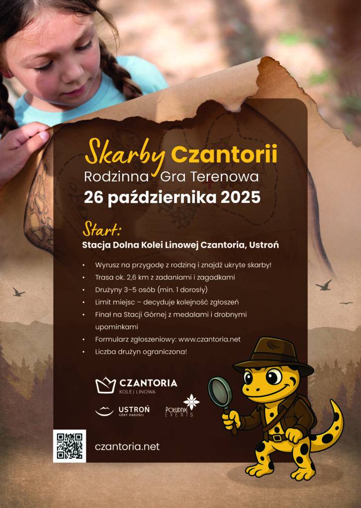 Zapraszamy do udziału w grze terenowej „Skarby Czantorii” – pełnej zagadek, wyzwań i leśnych niespodzianek. To idealna okazja, by wspólnie spędzić czas na świeżym powietrzu, poznać historię i legendy góry, a przy tym świetnie się bawić.