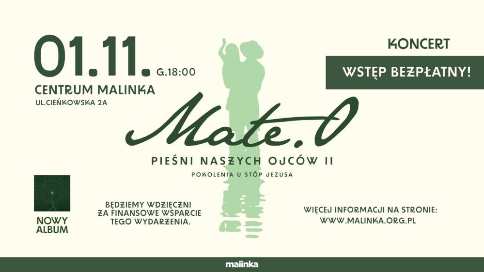 1 listopada 2025 w Centrum Malinka, o godz. 18:00 odbędzie się koncert Mate.O „Pieśni naszych ojców 2”.
