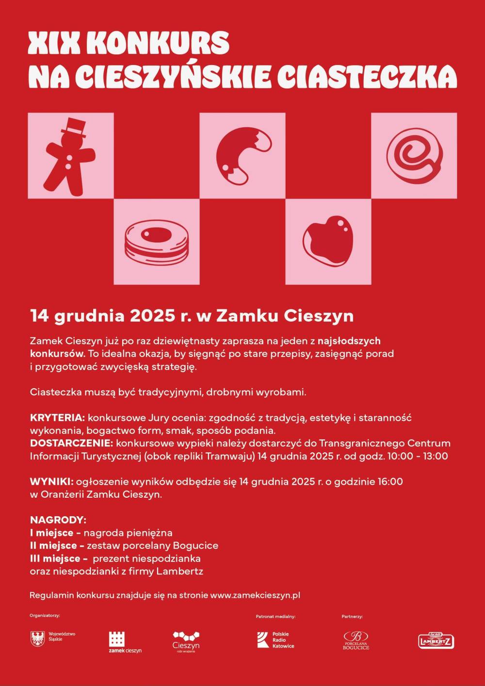 Zamek Cieszyn już po raz dziewiętnasty zaprasza na jeden z najsłodszych konkursów: XIX KONKURS NA CIESZYŃSKIE CIASTECZKA , który odbędzie się 14 grudnia 2025 r.