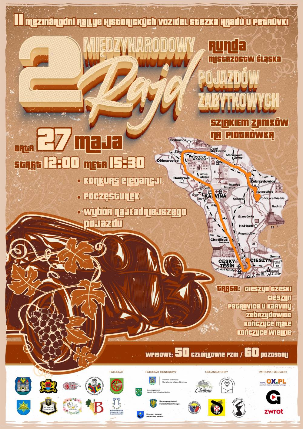 Serdecznie zapraszamy 27 maja 2023 na II Międzynarodowy Rajd Pojazdów Zabytkowych Szlakiem Zamków nad Piotrówką, rundę Mistrzostw Ślaska Pojazdów Zabytkowych. Start spod Hali Widowiskowo-Sportowej im. Cieszyńskich Olimpijczyków w Cieszynie o 12:00. Trasa przez Czeski Cieszyn, Karvinę, Petrovice, Zebrzydowice, Kończyce Małe i meta w Chateau w Kończycach Wielkich