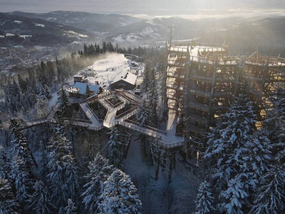 To dla turystów ogromna chwila! Już dziś 2 grudnia 2025 r. zapraszamy na pierwsze wejścia na nową Wieżę widokową Skolnity – wyjątkową, w pełni drewnianą konstrukcję, jakiej w Śląskim jeszcze nie było.